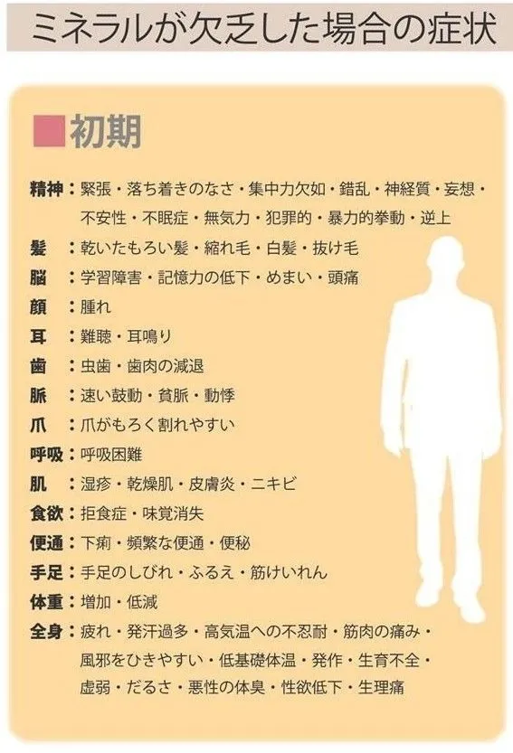 ミネラルが欠乏すると最初は誰にでも身に覚えのあるような症状があります。ところがこれがすすんでくると・・・